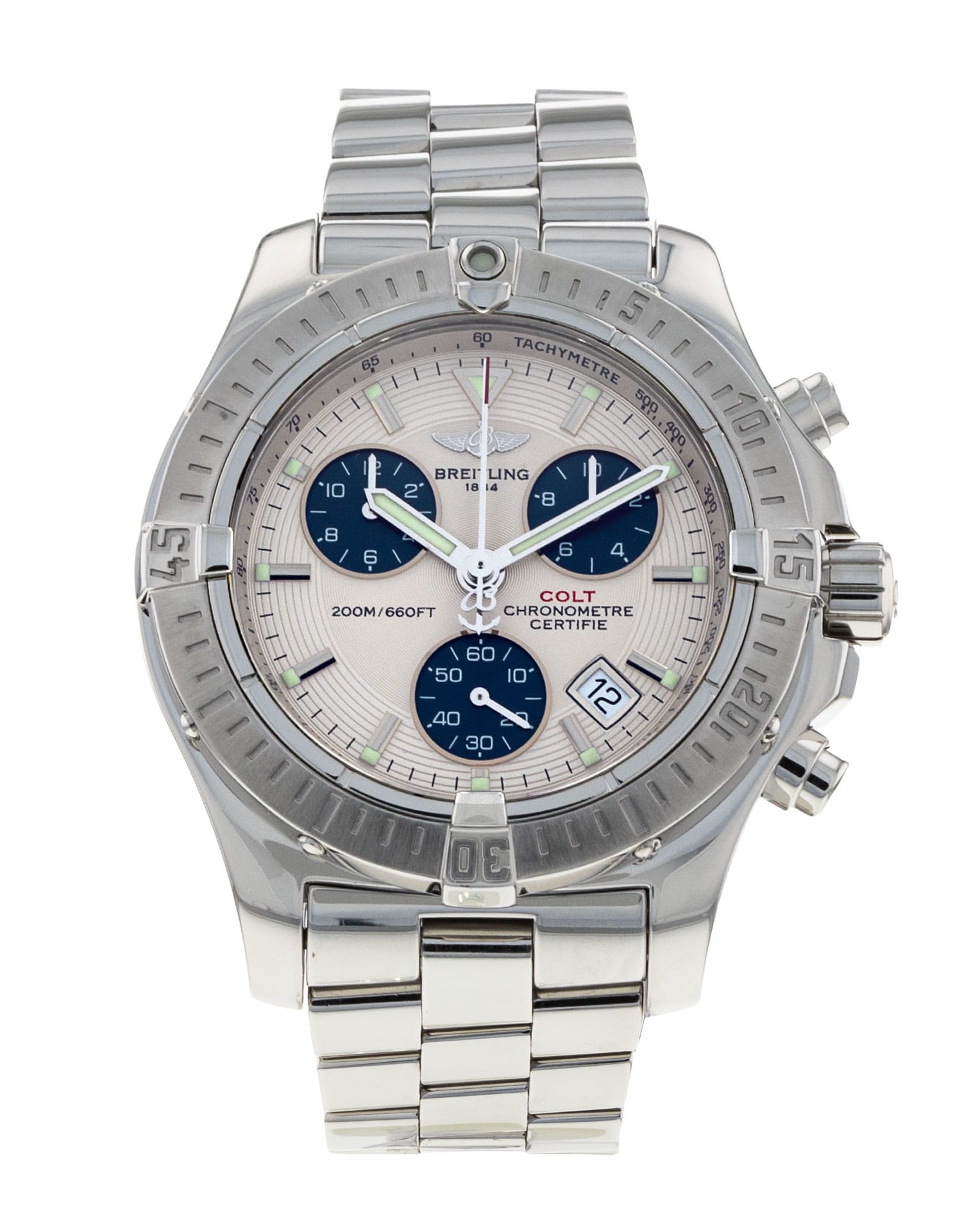Cette Breitling Colt Quartz A73380 a un cadran de baton argentée et un bracelet en bracelet. L'imperméabilité, la précision, le bon fonctionnement et l'état de cette Breitling ont été minutieusement inspectés afin de déterminer le degré de remise en état requis pour répondre à nos normes strictes. Nous avons également étudié sa documentation technique et les archives du fabricant, quand cela s'est avéré possible, afin de garantir l'authenticité de la montre et son passé irréprochable. Pour votre tranquillité d'esprit, toutes nos montres s'accompagnent d'une garantie de 24 mois.
