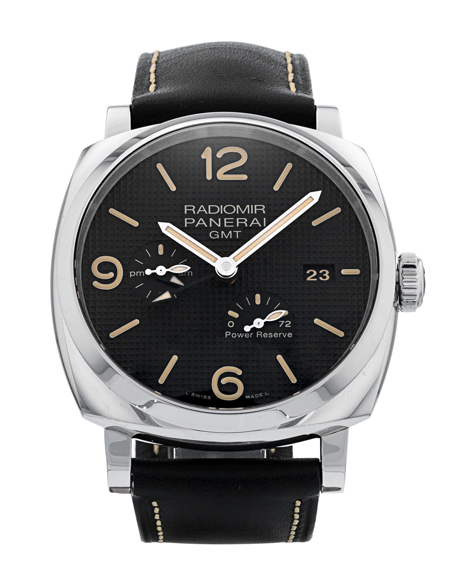 Cette Panerai Radiomir GMT PAM00628 a un cadran de trimestre noir arabe et un bracelet en cuir. La précision, le bon fonctionnement et l'état de cette Panerai ont été minutieusement inspectés dans notre centre de réparation Panerai certifié afin de déterminer le degré de remise en état requis pour répondre à nos normes strictes. Elle a également été comparée à nos archives afin de garantir son authenticité. Pour votre tranquillité d'esprit, toutes nos montres s'accompagnent d'une garantie de 24 mois.