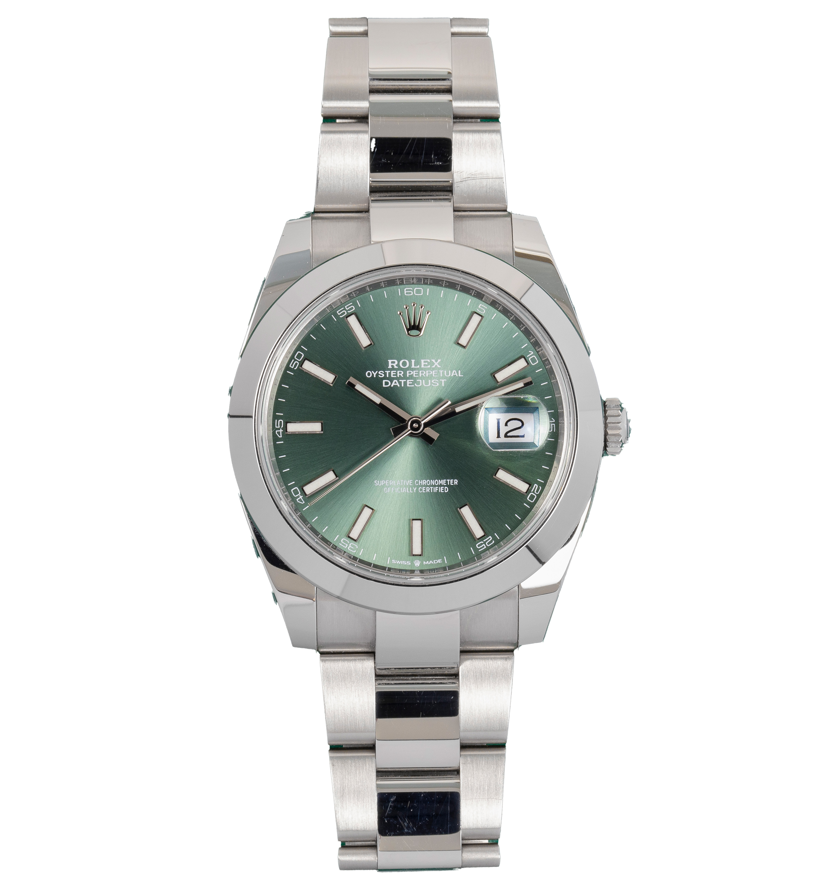 Cette Rolex Datejust 41 126300 a un cadran de baton vert et un bracelet en bracelet. L'imperméabilité, la précision, le bon fonctionnement et l'état de cette Rolex ont été minutieusement inspectés afin de déterminer le degré de remise en état requis pour répondre à nos normes strictes. Nous avons également étudié sa documentation technique et les archives du fabricant, quand cela s'est avéré possible, afin de garantir l'authenticité de la montre et son passé irréprochable. Pour votre tranquillité d'esprit, nos montres s'accompagnent d'une garantie de 24 mois, ainsi que de toute période restante sur la garantie du fabricant couvrant un produit neuf ou révisé. Afin de préserver la garantie du fabricant, cette montre n’a pas été polie dans notre centre de service.
