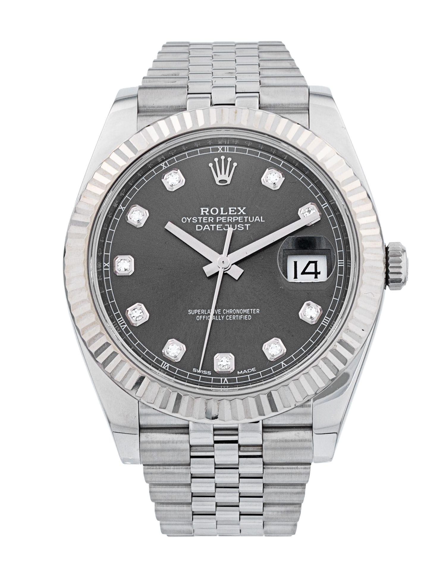 Cette Rolex Datejust 41 126334 a un cadran de slate diamond et un bracelet en bracelet. L'imperméabilité, la précision, le bon fonctionnement et l'état de cette Rolex ont été minutieusement inspectés afin de déterminer le degré de remise en état requis pour répondre à nos normes strictes. Nous avons également étudié sa documentation technique et les archives du fabricant, quand cela s'est avéré possible, afin de garantir l'authenticité de la montre et son passé irréprochable. Pour votre tranquillité d'esprit, nos montres s'accompagnent d'une garantie de 24 mois, ainsi que de toute période restante sur la garantie du fabricant couvrant un produit neuf ou révisé. Afin de préserver la garantie du fabricant, cette montre n’a pas été polie dans notre centre de service.