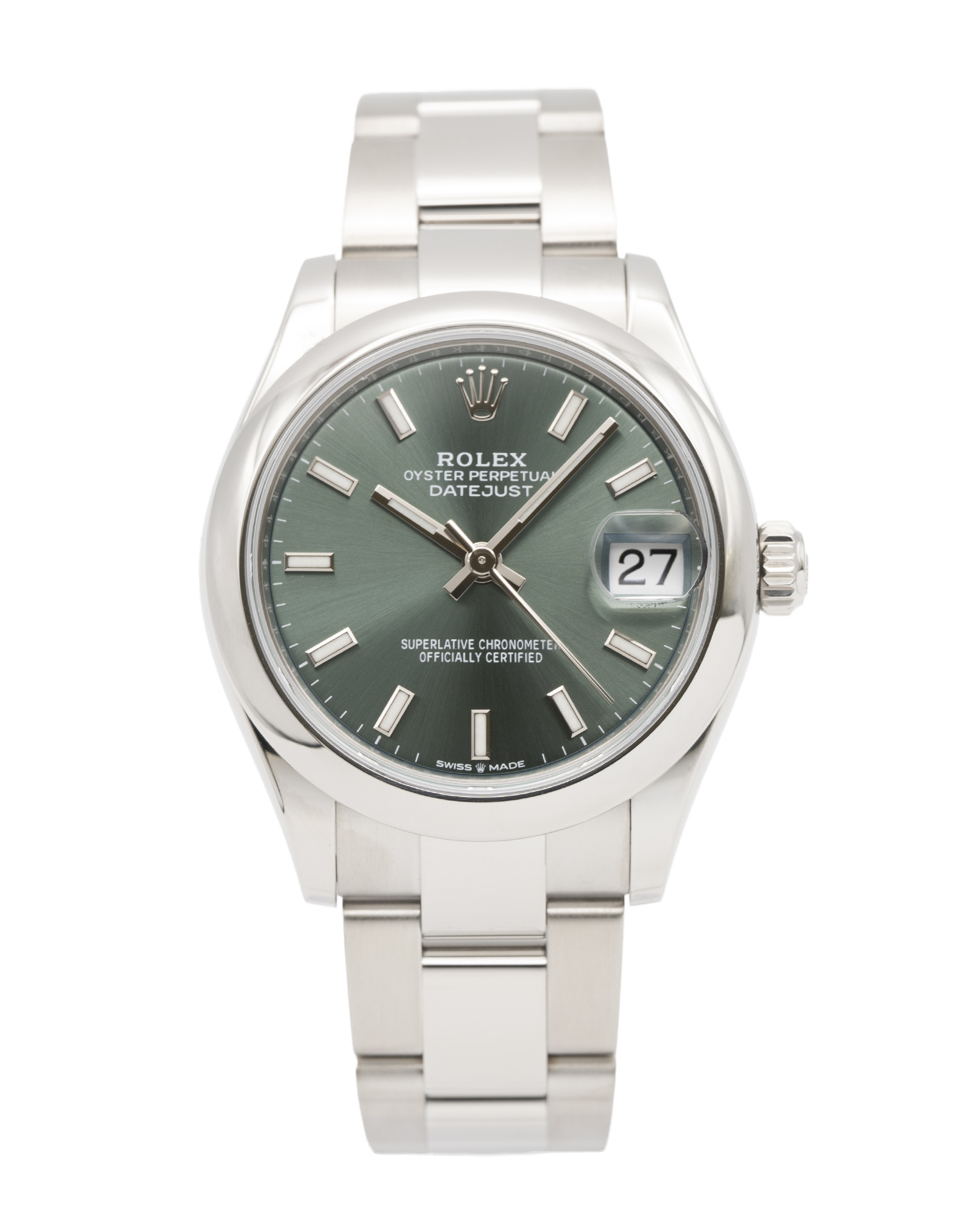 Cette Rolex Datejust Lady 31 278240 a un cadran de baton verte et un bracelet en bracelet. L'imperméabilité, la précision, le bon fonctionnement et l'état de cette Rolex ont été minutieusement inspectés afin de déterminer le degré de remise en état requis pour répondre à nos normes strictes. Nous avons également étudié sa documentation technique et les archives du fabricant, quand cela s'est avéré possible, afin de garantir l'authenticité de la montre et son passé irréprochable. Pour votre tranquillité d'esprit, nos montres s'accompagnent d'une garantie de 24 mois, ainsi que de toute période restante sur la garantie du fabricant couvrant un produit neuf ou révisé. Afin de préserver la garantie du fabricant, cette montre n’a pas été polie dans notre centre de service.