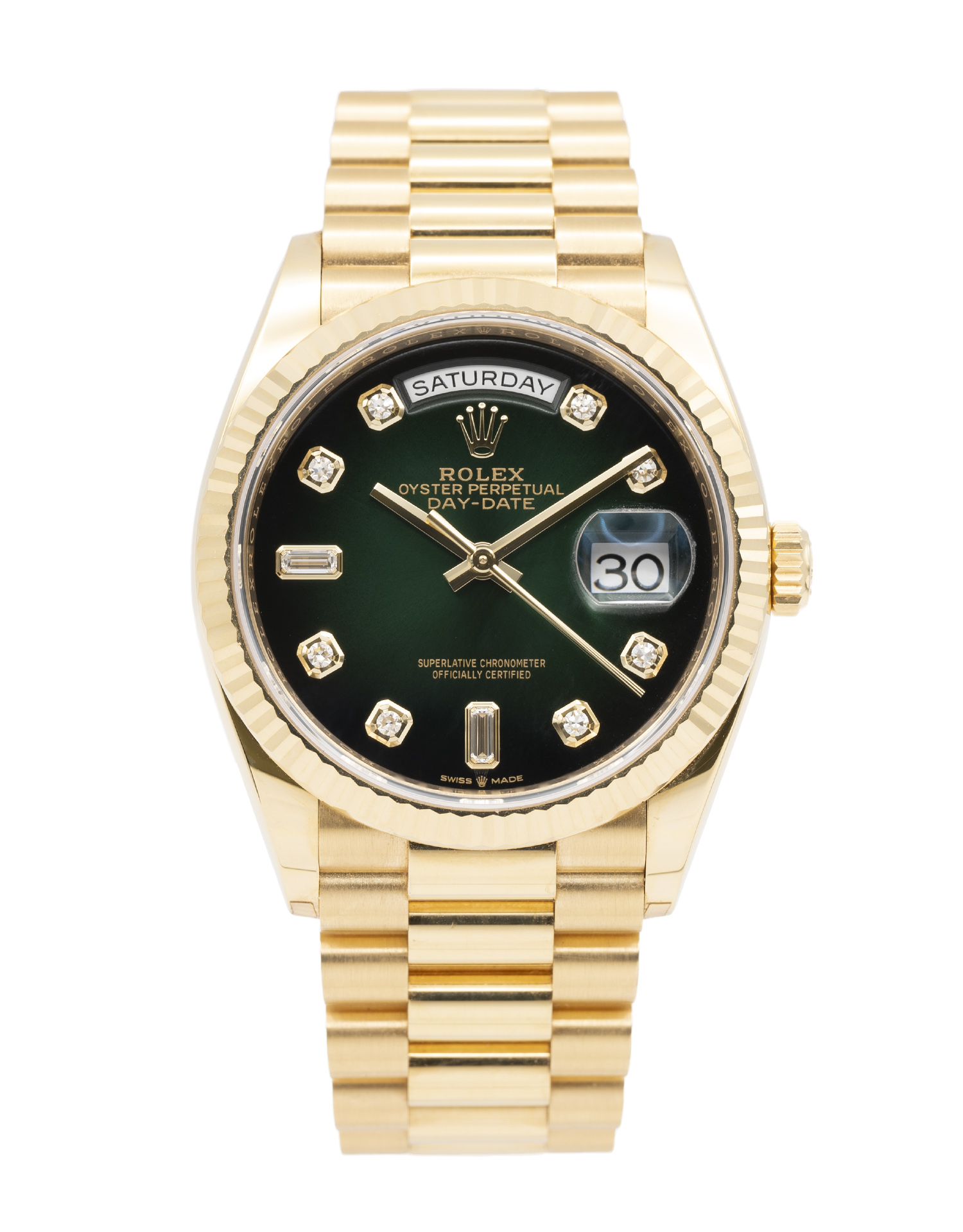 Cette Rolex Day-Date 36 128238 a un cadran de diamant vert et un bracelet en bracelet. L'imperméabilité, la précision, le bon fonctionnement et l'état de cette Rolex ont été minutieusement inspectés afin de déterminer le degré de remise en état requis pour répondre à nos normes strictes. Nous avons également étudié sa documentation technique et les archives du fabricant, quand cela s'est avéré possible, afin de garantir l'authenticité de la montre et son passé irréprochable. Pour votre tranquillité d'esprit, nos montres s'accompagnent d'une garantie de 24 mois, ainsi que de toute période restante sur la garantie du fabricant couvrant un produit neuf ou révisé. Afin de préserver la garantie du fabricant, cette montre n’a pas été polie dans notre centre de service.
