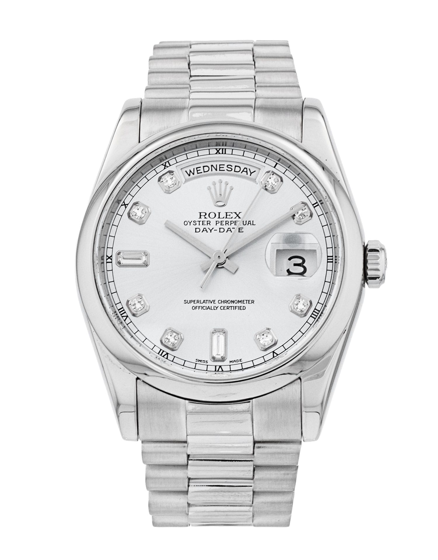 Cette Rolex Day-Date 118209 a un cadran de argent diamant et un bracelet en bracelet. L'imperméabilité, la précision, le bon fonctionnement et l'état de cette Rolex ont été minutieusement inspectés afin de déterminer le degré de remise en état requis pour répondre à nos normes strictes. Nous avons également étudié sa documentation technique et les archives du fabricant, quand cela s'est avéré possible, afin de garantir l'authenticité de la montre et son passé irréprochable. Pour votre tranquillité d'esprit, toutes nos montres s'accompagnent d'une garantie de 24 mois. L’un de nos techniciens spécialisés dans le polissage a éliminé les marques d’usure quotidienne sur le boîtier et le bracelet de cette montre. Par conséquent, cette montre n’est pas couverte par la garantie restante du fabricant.