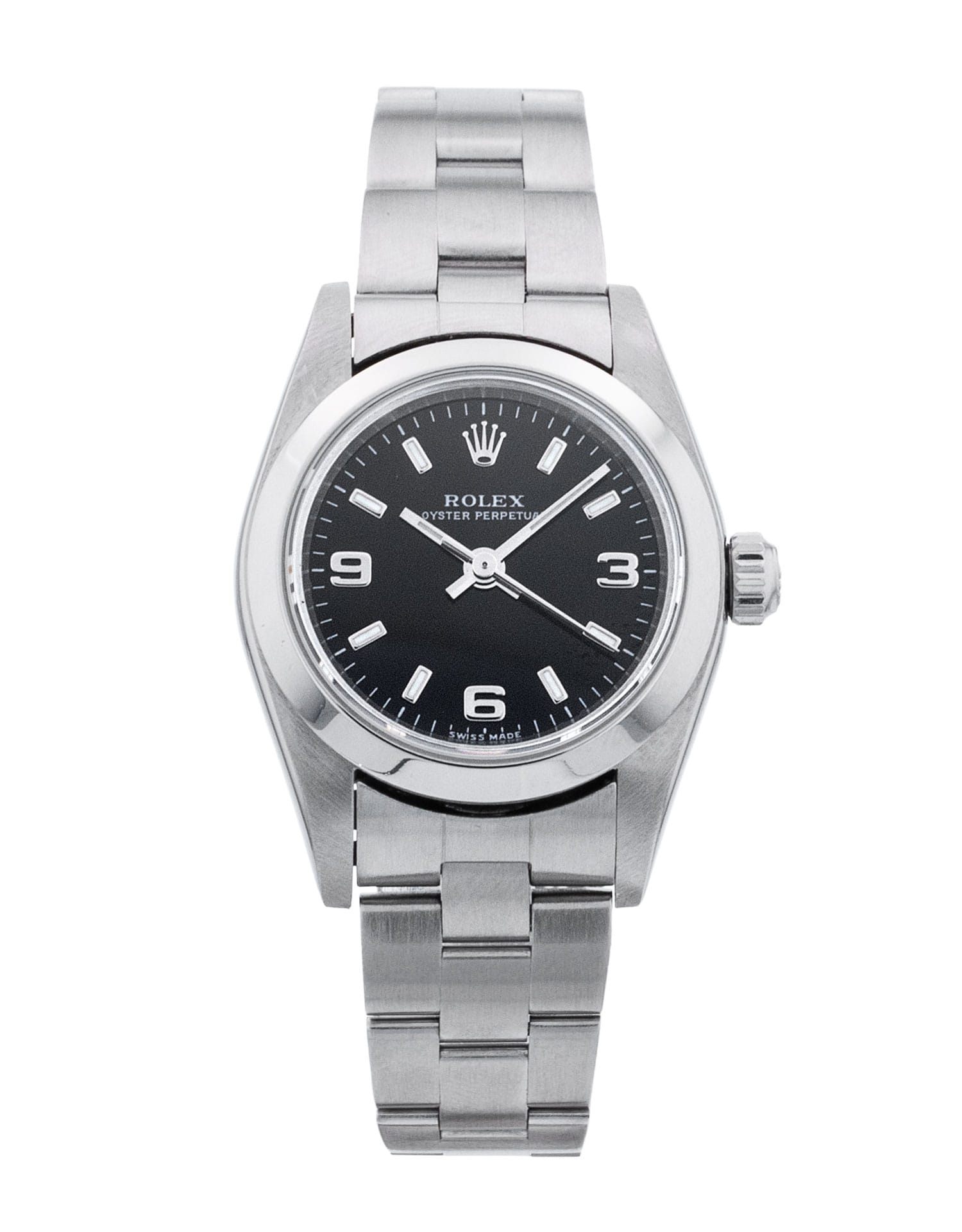 Cette Rolex Lady Oyster Perpetual 76080 a un cadran de trimestre noir arabe et un bracelet en bracelet. L'imperméabilité, la précision, le bon fonctionnement et l'état de cette Rolex ont été minutieusement inspectés afin de déterminer le degré de remise en état requis pour répondre à nos normes strictes. Nous avons également étudié sa documentation technique et les archives du fabricant, quand cela s'est avéré possible, afin de garantir l'authenticité de la montre et son passé irréprochable. Pour votre tranquillité d'esprit, toutes nos montres s'accompagnent d'une garantie de 24 mois. L’un de nos techniciens spécialisés dans le polissage a éliminé les marques d’usure quotidienne sur le boîtier et le bracelet de cette montre. Par conséquent, cette montre n’est pas couverte par la garantie restante du fabricant.